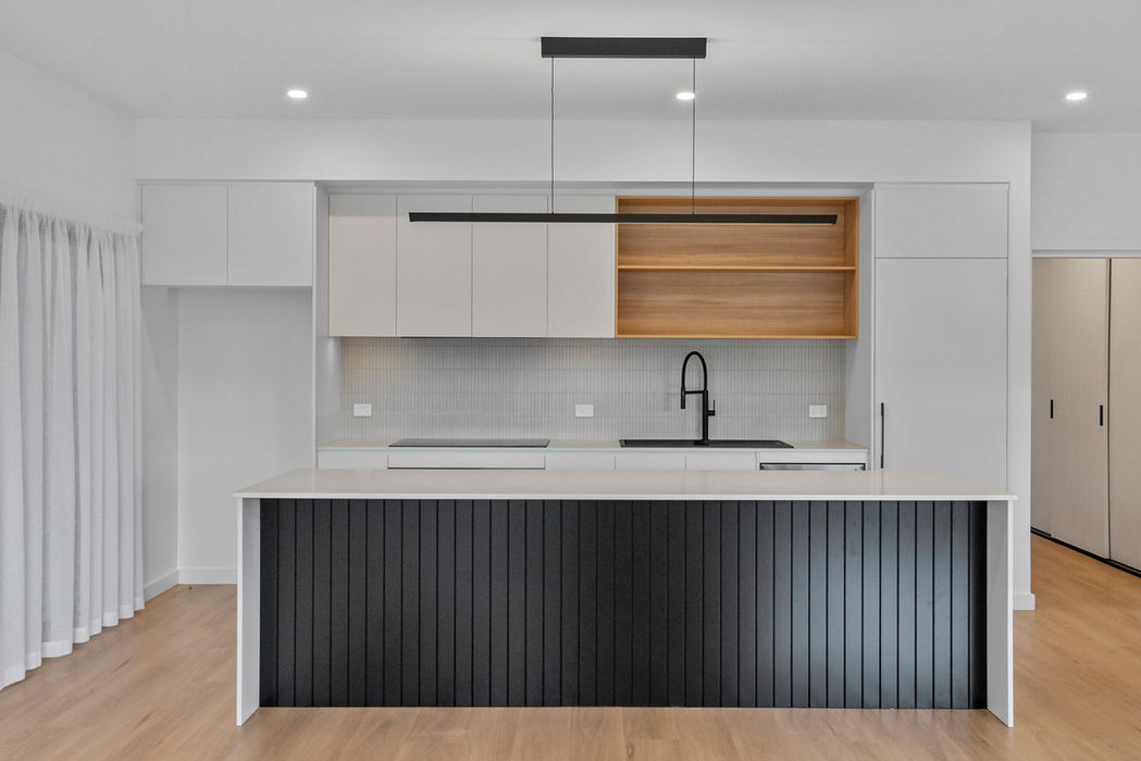 Our client’s now step into a world of refined living as they enter the open-plan living spaces. The heart of the home features a stunning black vertical clad island bench, elegantly contrasting against the pristine white stone bench top and sleek matte white cupboards. Timber shelves add a touch of natural warmth, creating a perfect balance of materials that evoke both luxury and comfort. The black feature barn-door adds a unique focal point, showcasing the attention to detail and thoughtful design found throughout the property.